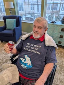 John’s team of caregivers all played a role in making his dream a reality, including Volunteer Coordinator Kate, Chaplain Steve, Nurse Sarah, Clinical Team Manager Emily, Social Worker Al, and Volunteer Blake, as they joined him for the chilly occasion. Tubs of icy water were set up for plunging, and the theme of polar bears was reinforced with polar bear-themed Coca-Colas and polar bear towels. The team even had a custom “Polar Bear Plunge 2026” shirt made up for John!